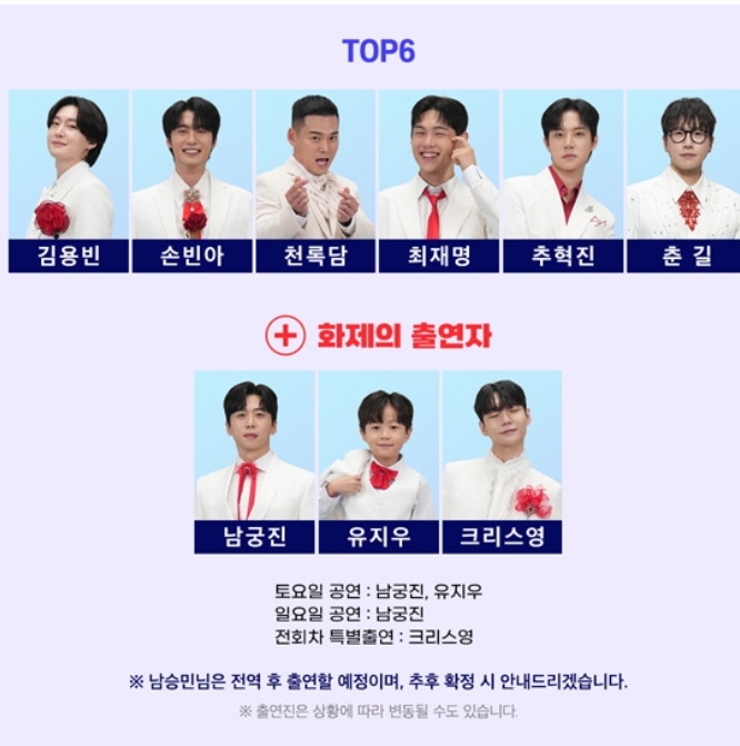 이들은 〈미스터트롯3〉 결승전에 진출한 TOP7 멤버들로, 각자의 매력과 실력을 무대에서 선보일 예정입니다