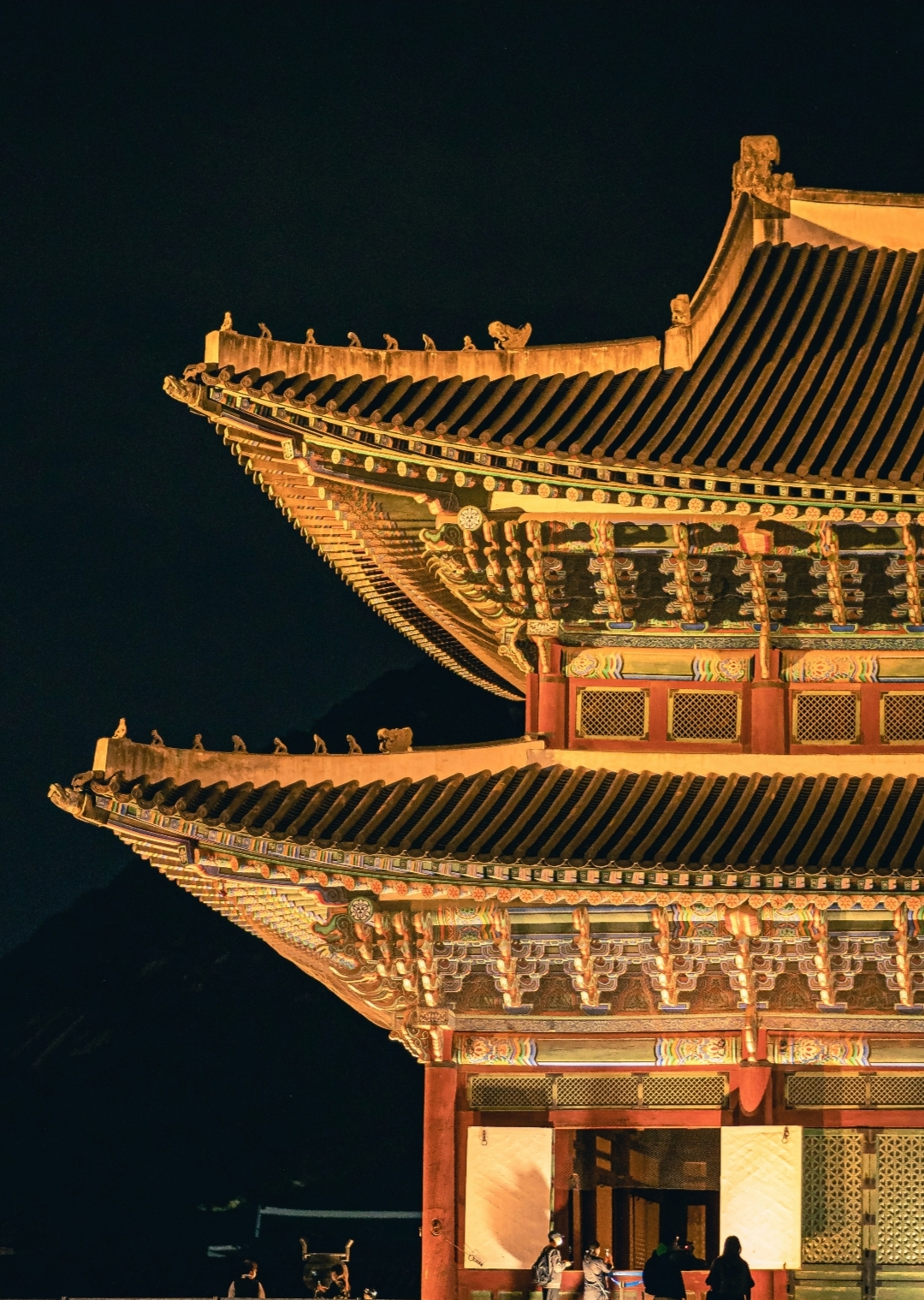 야간 조명 아래에서 비치는 경복궁의 웅장한 자태는 낮과는 또 다른 매력을 선사합니다.