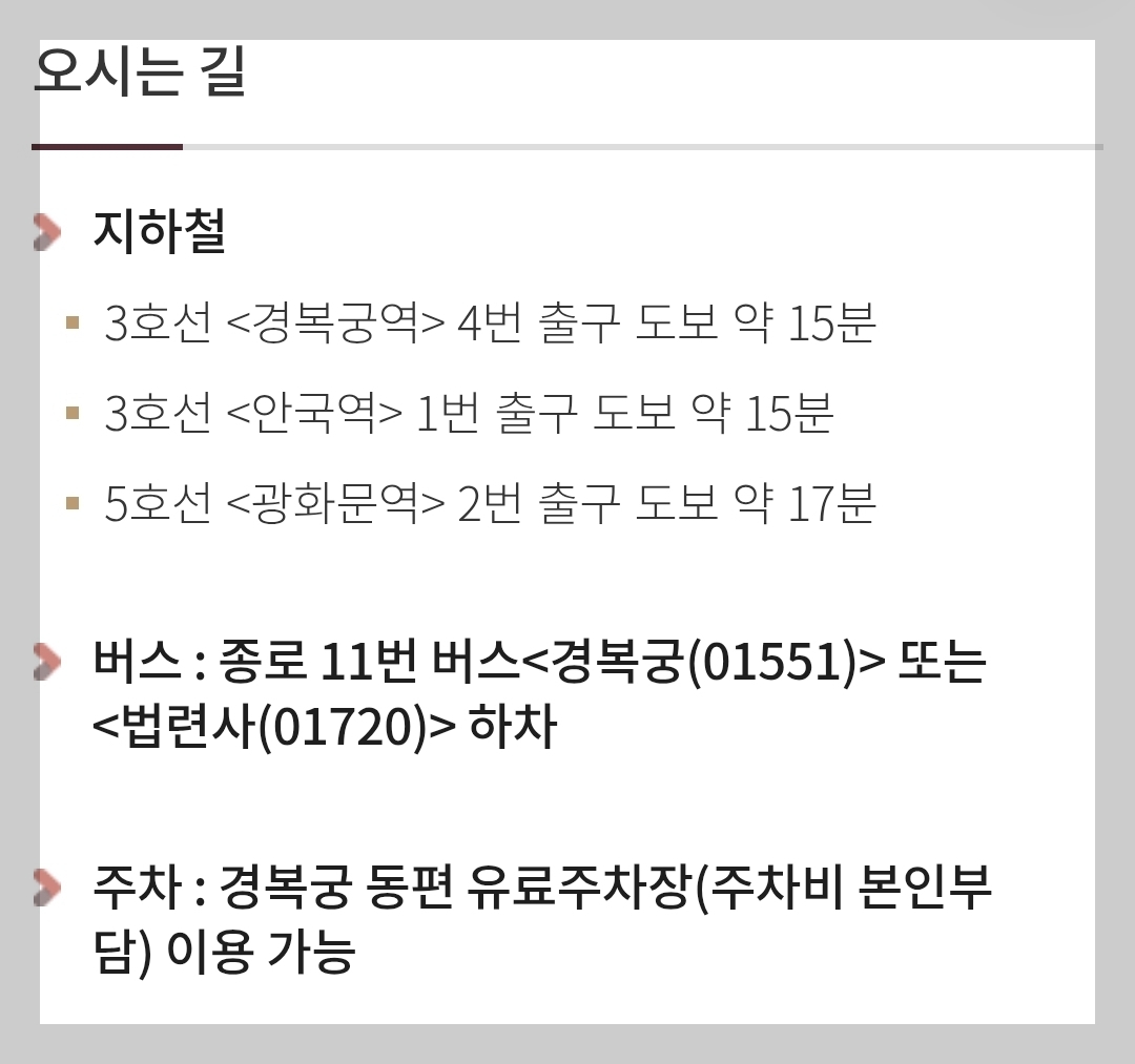 주차: 경복궁 주차장이 있지만 공간이 협소하므로 대중교통 이용을 추천드립니다.