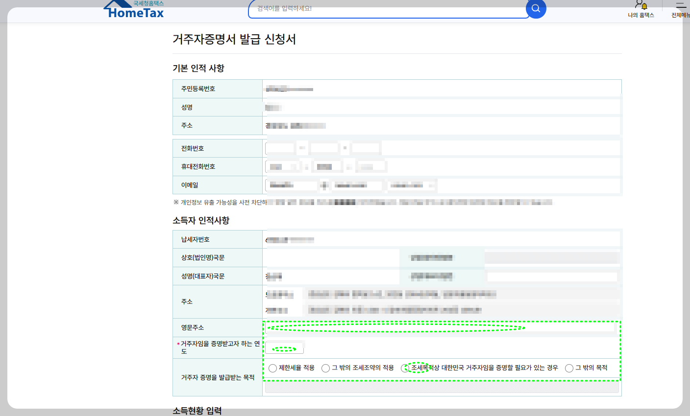 소득인적사항에 주소밑에 영문주소를 적어야하고 거주자임을 증명받고자 하는 년도는 2025라고 적습니다