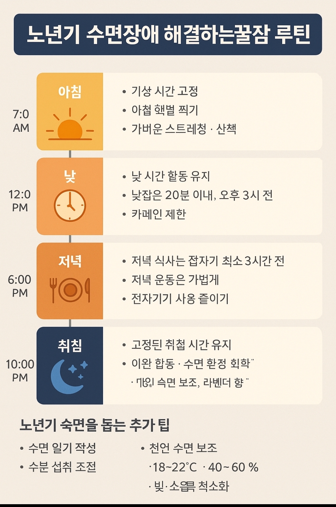 노년기 수면장애를 극복하려면 아침부터 리듬을 맞추는 것이 핵심입니다.