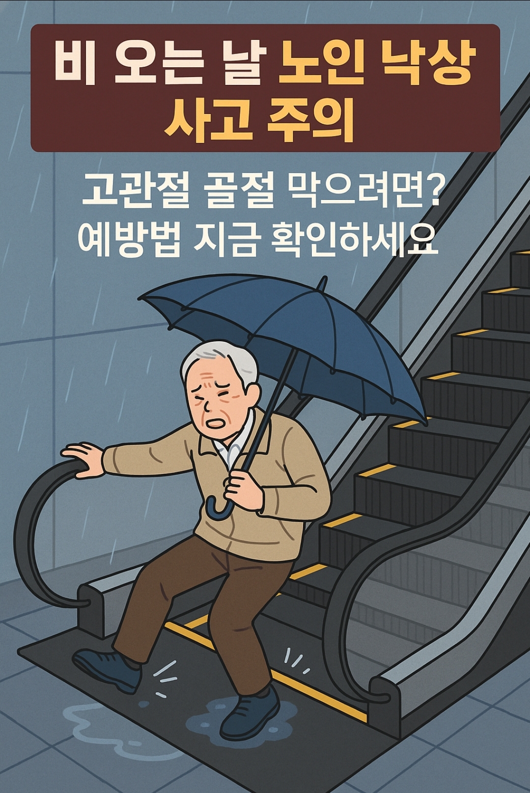장마철이면 길거리에 미끄러운 곳이 많아지며, 특히 노인 낙상사고가 급증합니다. 신발에 묻은 물기로 인해 지하철 에스컬레이터, 무빙워크, 보도블럭, 대리석 바닥 등에서 미끄러지는 사고가 자주 발생합니다.