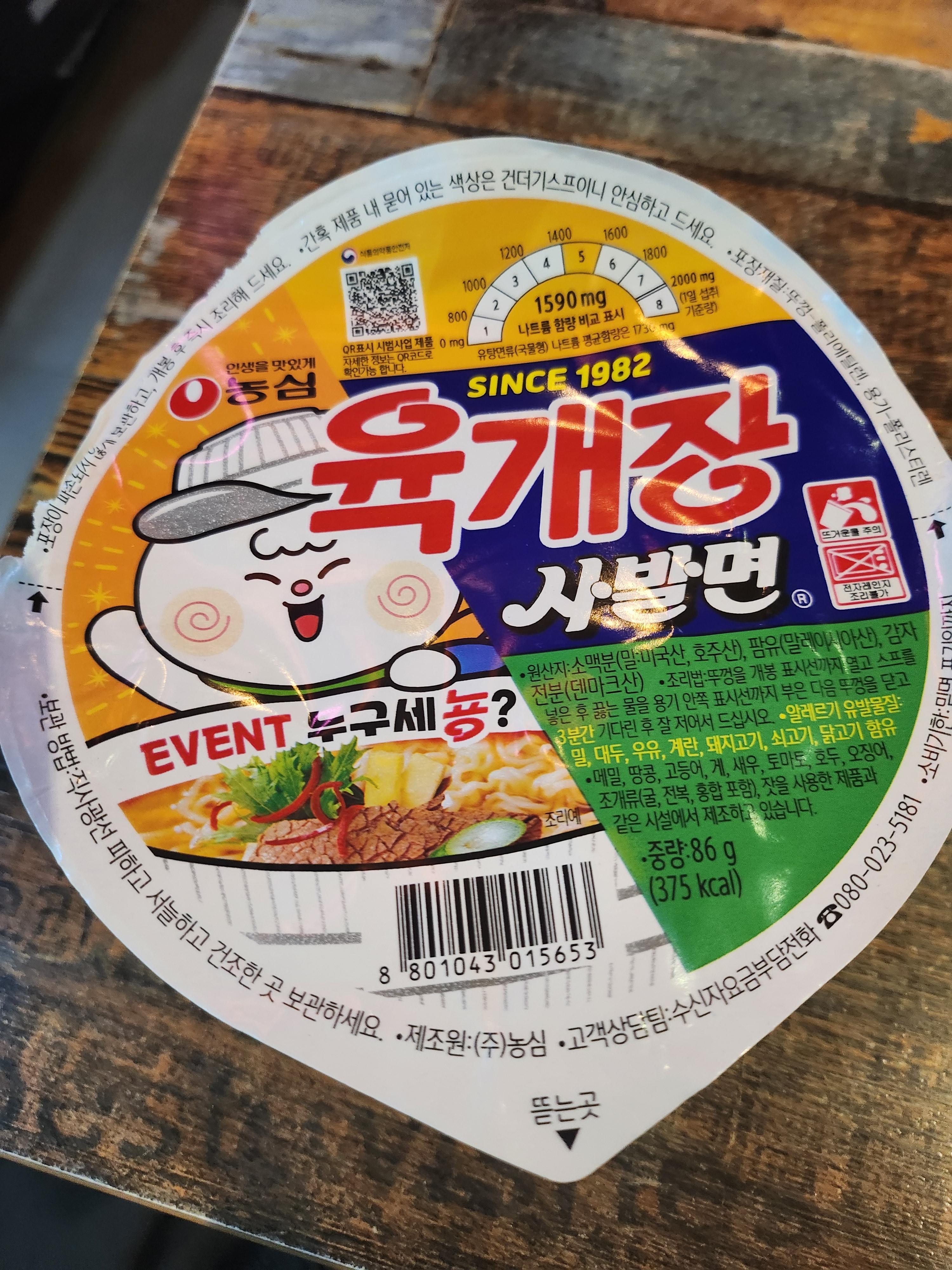 이벤트 내용: 컵라면 뚜껑에 있는 "농이" 캐릭터를 찍고 인스타그램에 특정 해시태그(#농심, #유캐싱사태범, #농심농이)와 함께 업로드하는 방식으로 참여하는 이벤트입니다. QR 코드를 통해 더 자세한 정보를 얻을 수 있습니다.