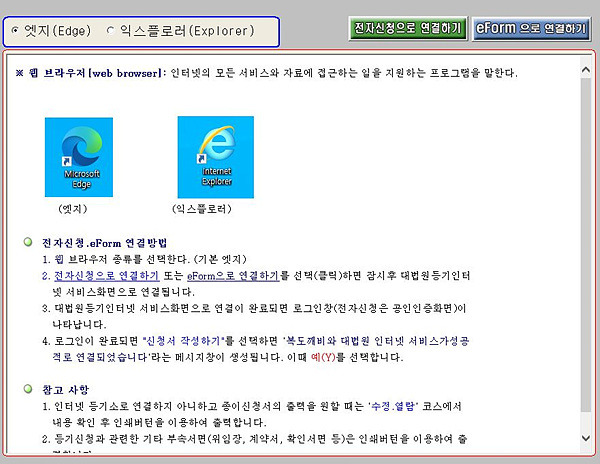 - e-Form 신청 : 온라인에서 등기신청서를 작성하고 출력하여 제출할 수 있는 기능을 제공합니다.