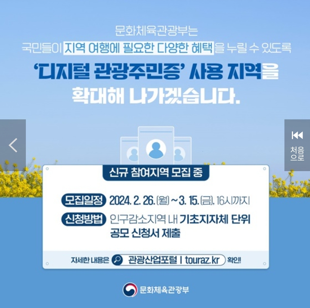 문화체육관광부는 앞으로도 더 많은 지역에서 디지털 관광주민증을 사용할 수 있도록 지원을 확대할 예정입니다. 지금 바로 대한민국 구석구석 누리집에서 신청해, 소멸 위기의 지역을 구하고 특별한 혜택도 누려보세요