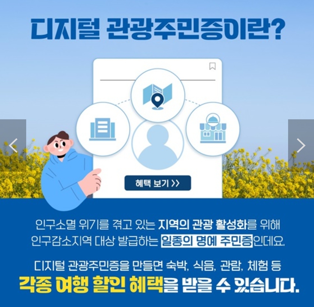관광도 즐기고 지역 혜택도 누릴 수 있는 ‘디지털 관광주민증’, 들어보셨나요?지역 관광 활성화를 위해 문화체육관광부가 주관하는 이 제도는, 특정 지역을 자주 방문하거나 장기 체류하는