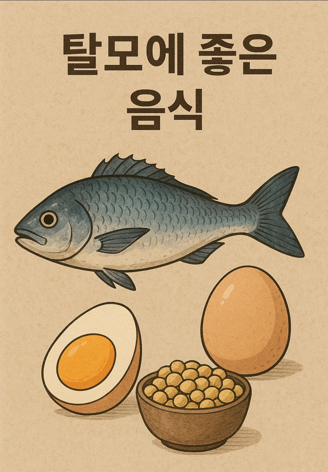 단백질 공급원: 계란, 콩류, 두부, 생선 등은 모발 구성 성분인 케라틴 형성에 필수입니다.
