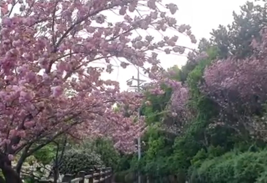 3. 전망대 방향 산책길: 겹벚꽃과 함께 부산항이 보이는 풍경이 감탄을 자아냄.