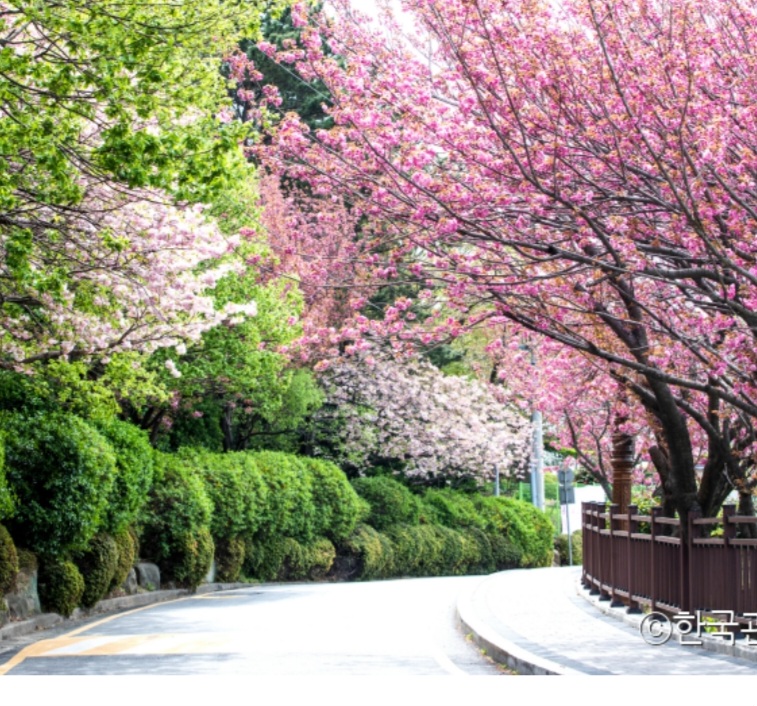 1. 민주공원 진입로 벚꽃길: 길 양옆에 겹벚꽃이 터널처럼 이어져 사진 명소로 인기.