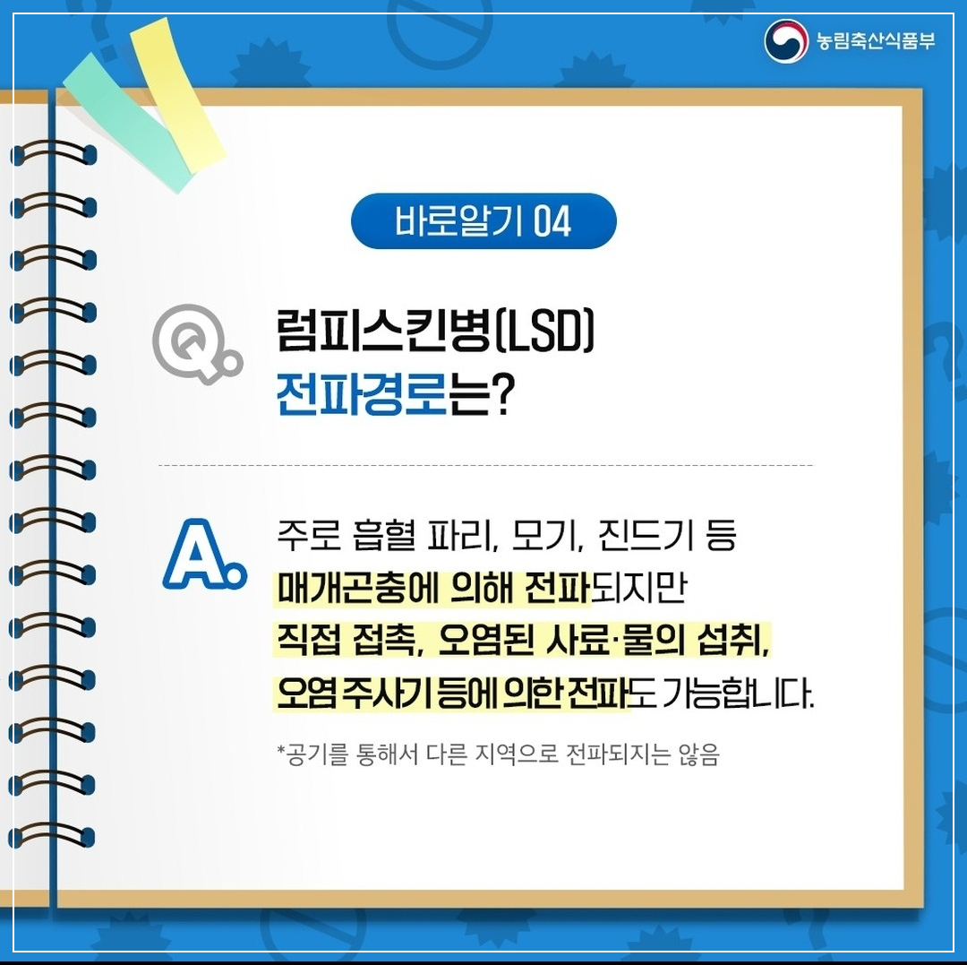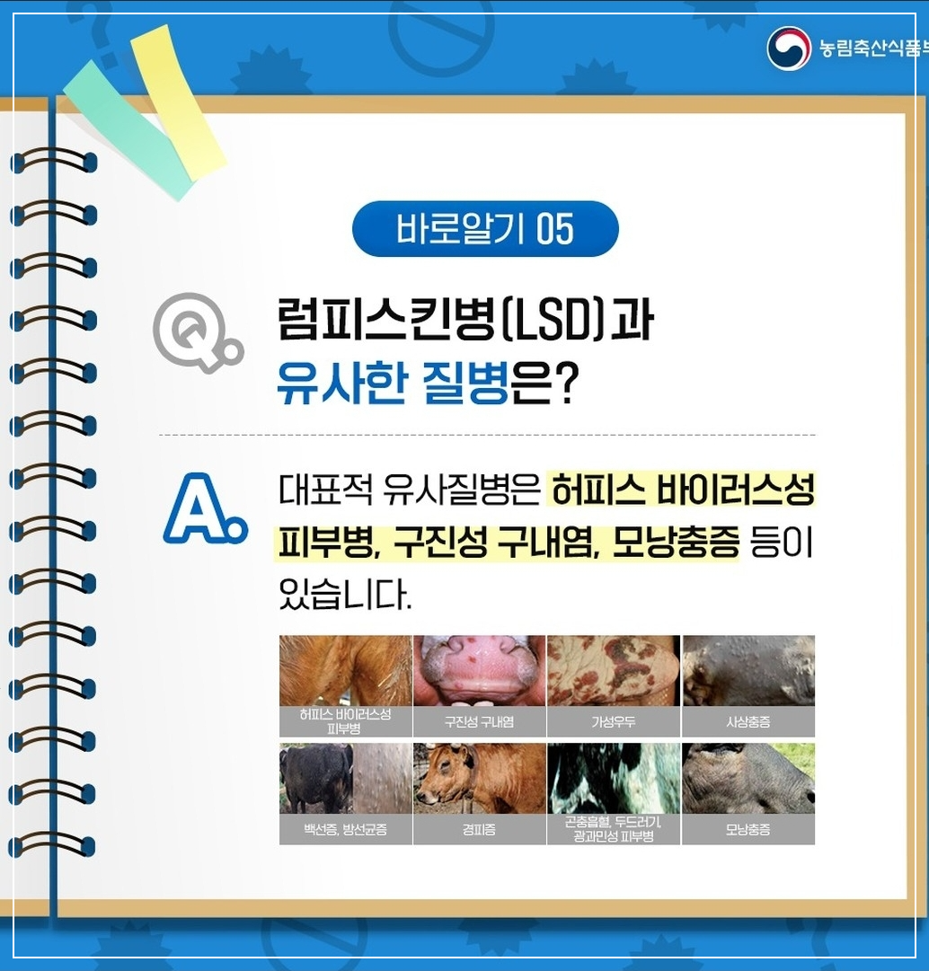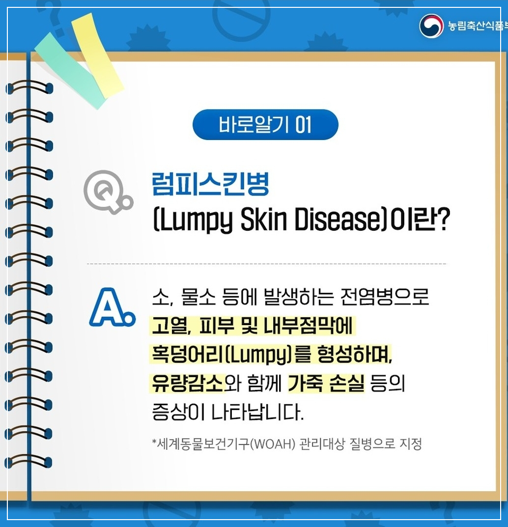 럼피스킨병은 1929년 아프리카 잠비아에서 처음 발생했다. 소에게만 감염되는 전염병으로 증상으로는 고열과 단단한 혹 같은 피부 결절이 특징이다. 모기 등 흡혈 곤충에 의해 주로 전파되는 바이러스성 질병으로 폐사율은 10% 이하로 알려져 있다. 국내에서는 '제1종 가축전염병'으로 지정돼 있으며, 사람에게는 전파되지 않지만 우유 생산량이 줄고, 유산이나 불임 등 증상이 나타날 수 있다.