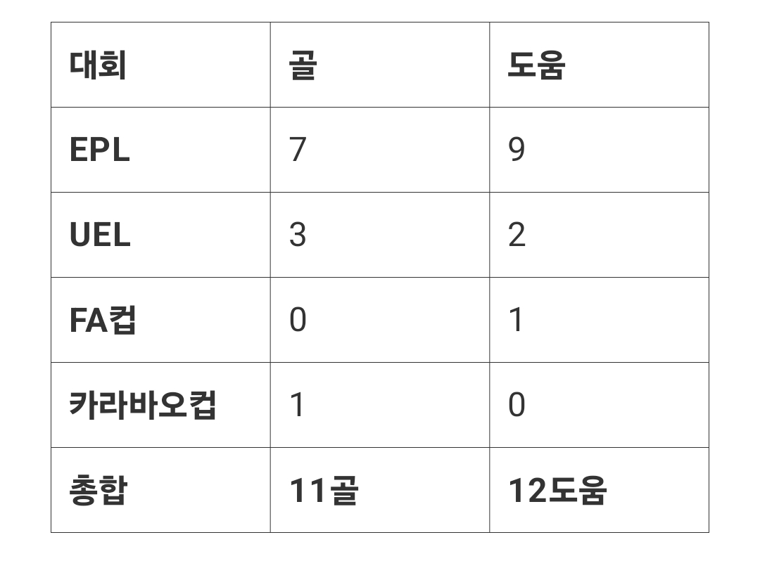 올 시즌 손흥민의 공격 포인트는 다음과 같습니다.
