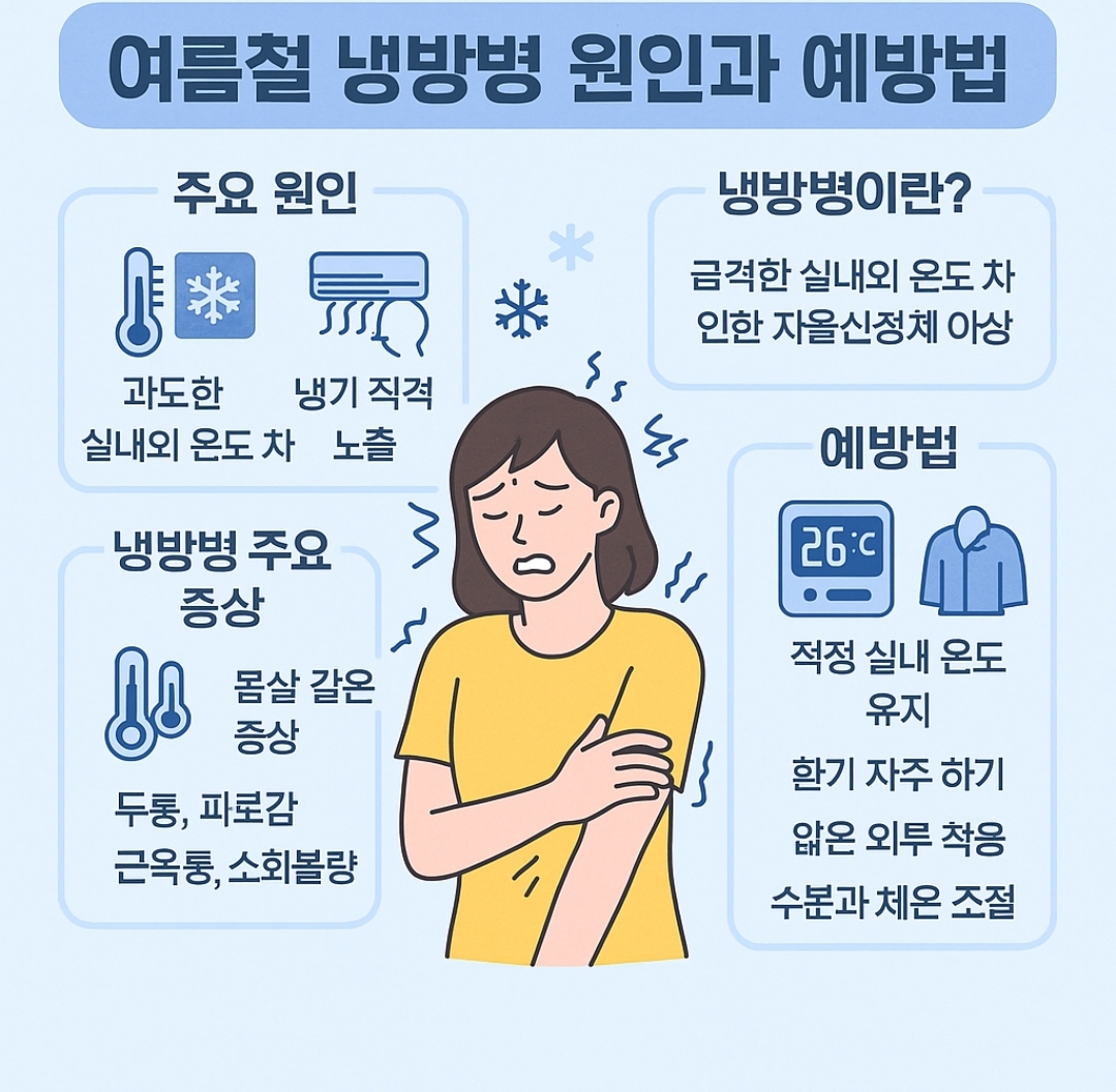 **냉방병(냉방증후군)**은 여름철 과도한 냉방 환경에서 생활하면서 체온조절 기능이 약해지고, 면역력과 자율신경계 기능이 저하되어 발생하는 일련의 증상들을 말합니다.