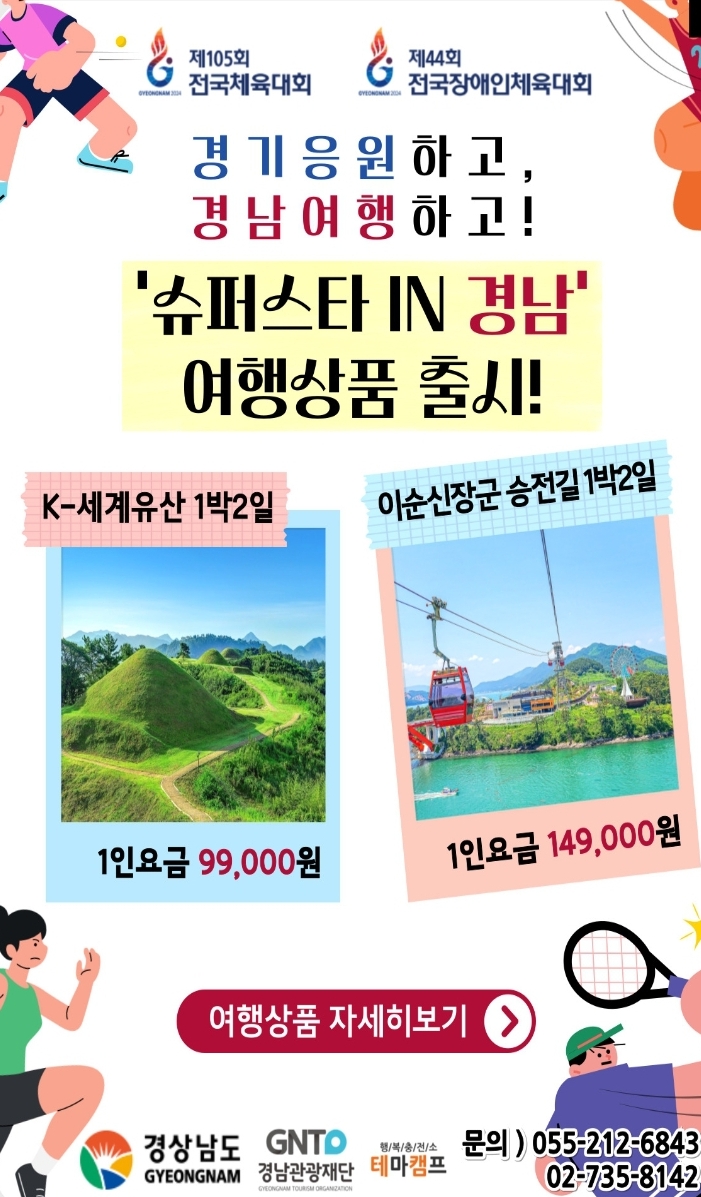 안녕하세요! 경남에서 특별한 여행을 즐기며 체육대회 응원까지 할 수 있는 기회를 소개해드립니다. 이번에 경남에서 열리는 제105회 전국체육대회와 제44회 전국장애인체육대회에 맞춰 여행 상품이 출시되었습니다. 두 가지 특별한 여행 상품을 통해 아름다운 경남을 만끽하고, 스포츠 열기 속에서 잊지 못할 추억을 만들어보세요!
