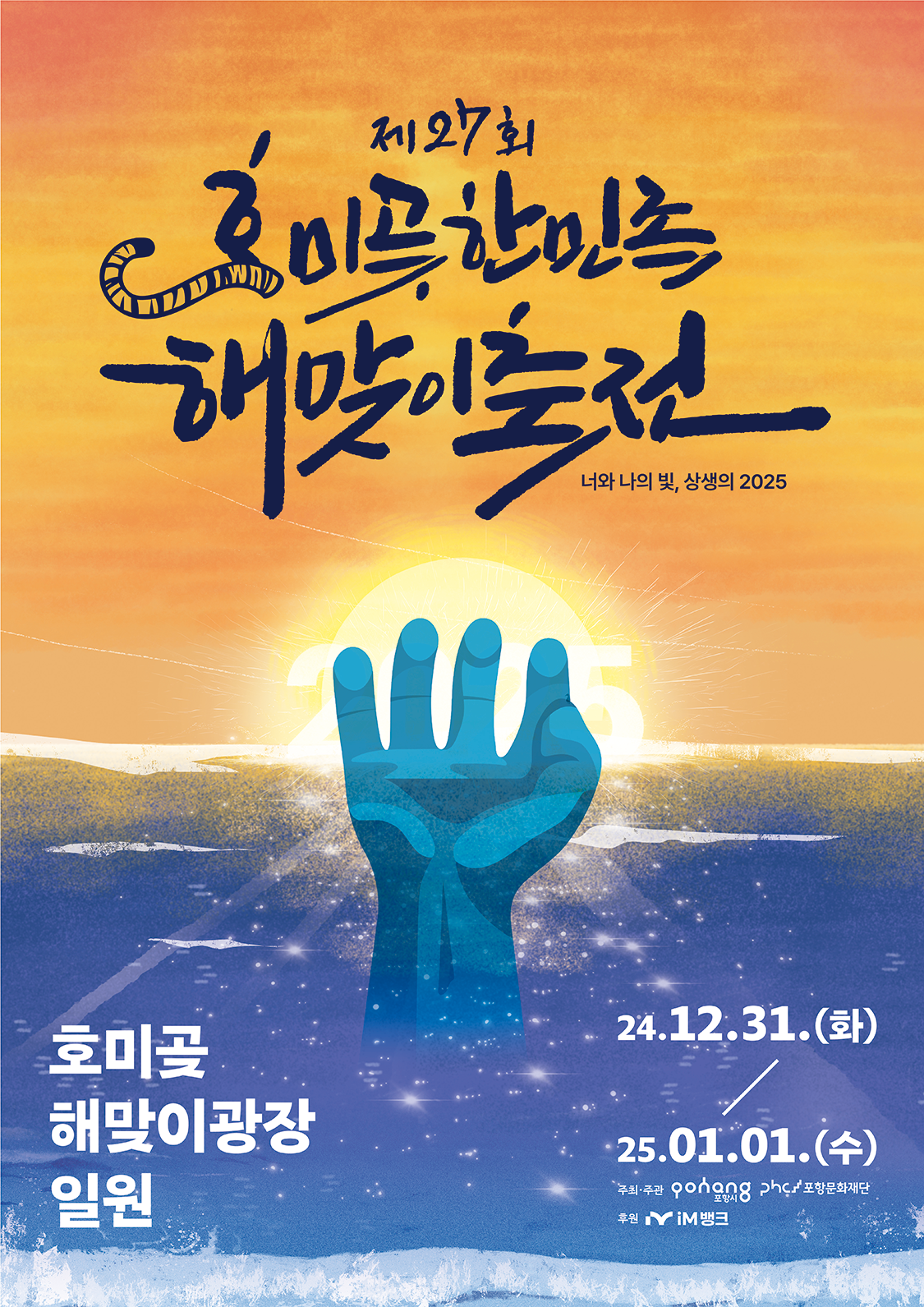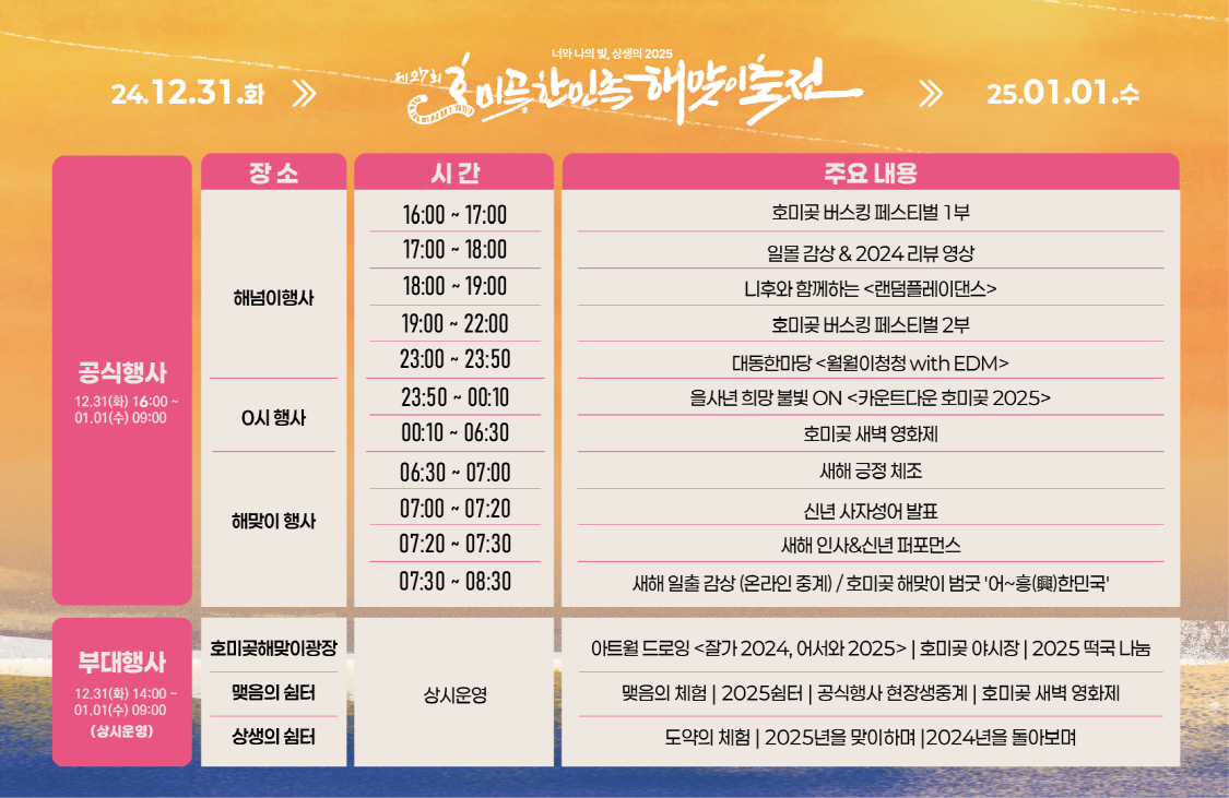 **"너와 나의 빛, 상생의 2025"**라는 주제 아래, 모두가 희망을 품고 새로운 도약을 준비할 수 있는 뜻깊은 시간이 될 것입니다. 가족, 친구, 연인과 함께 호미곶에서 새해의 첫 태양을 맞이하며 특별한 추억을 만들어 보세요.