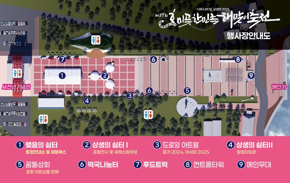 자가용: 행사장 주변에 마련된 임시 주차장을 이용하실 수 있으며, 혼잡을 피하기 위해 서둘러 도착하는 것이 좋습니다.