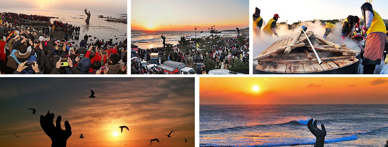 상징적인 상생의 손 조각상은 해맞이 축전의 대표적인 포토존으로, 바다 위로 떠오르는 태양과 함께 감동적인 장면을 연출합니다.