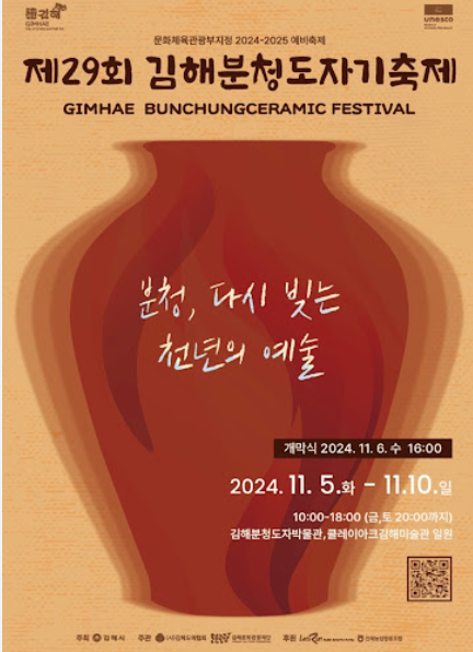 한국 전통 도자기 문화의 하나인 분청사기를 기념하고, 그 가치를 재조명하기 위해 마련된 제29회 김해분청도자기축제가 다가오고 있습니다. 이번 축제는 2024년 11월 5일(화)부터 11월 10일(일)까지 김해분청도자박물관과 클레이아크김해미술관 일원에서 열리며, 다양한 전시와 체험, 문화 공연 등을 통해 전통의 매력을 새롭게 느낄 수 있는 특별한 시간이 될 것입니다. 이번 블로그 포스팅에서는 김해분청도자기축제에 대한 세부 정보와 함께 방문객들이 즐길 수 있는 프로그램들을 자세히 소개하겠습니다.