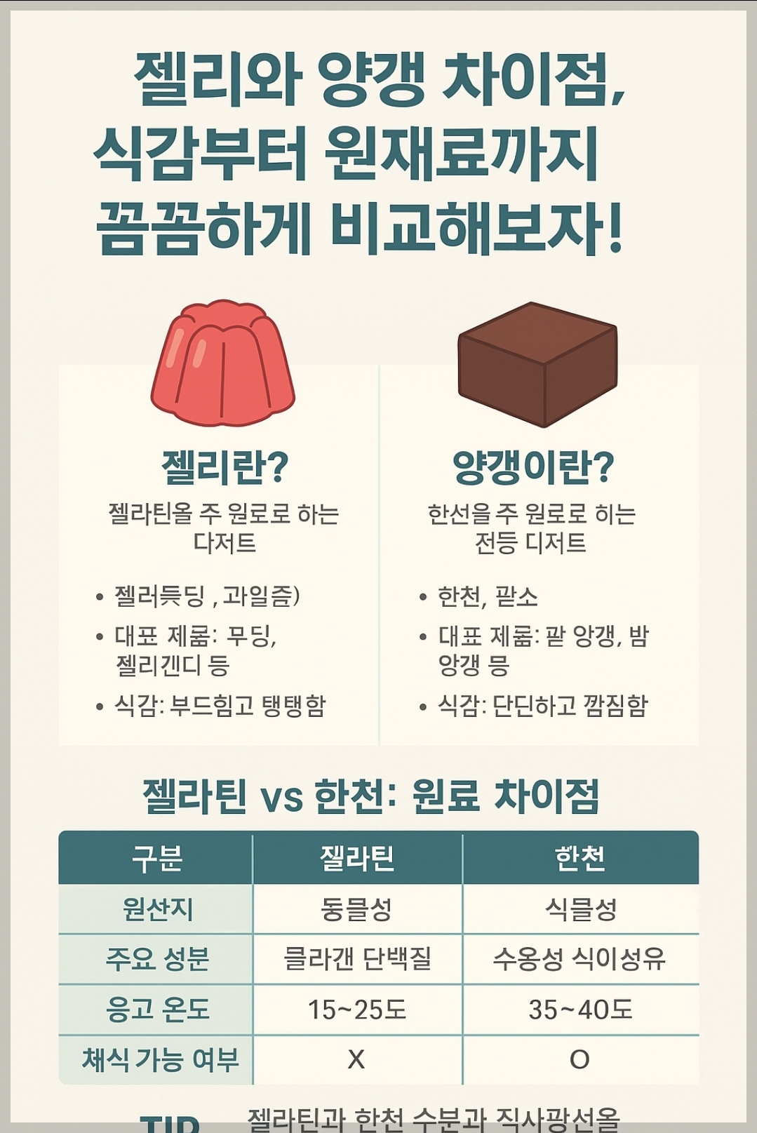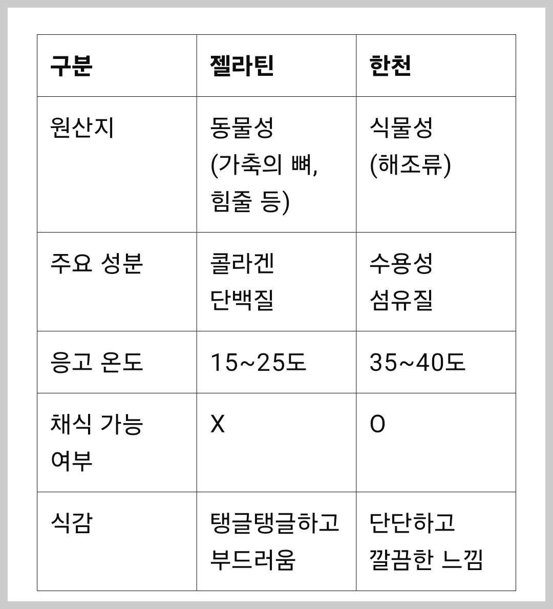 TIP: 젤라틴과 한천 모두 습기와 직사광선을 피해서 건조하고 서늘한 곳에 보관해야 변질을 막을 수 있습니다.