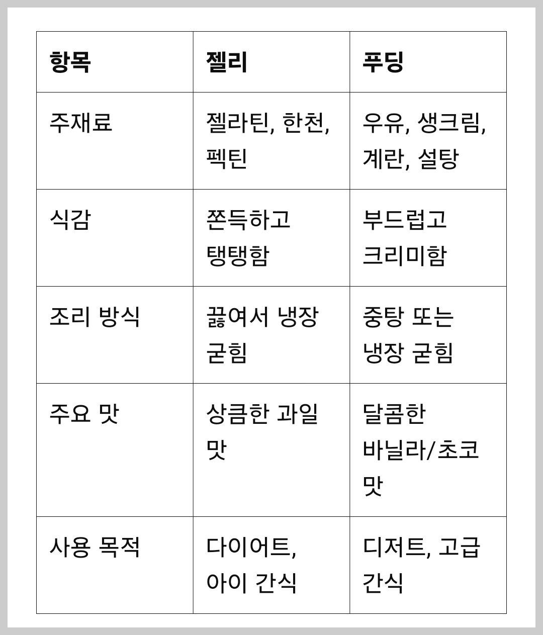 젤리는 가볍고 상큼한 느낌을 주는 반면, 푸딩은 무겁고 진한 풍미가 느껴져 디저트의 무게감과 맛에서 확실한 차이를 보입니다.