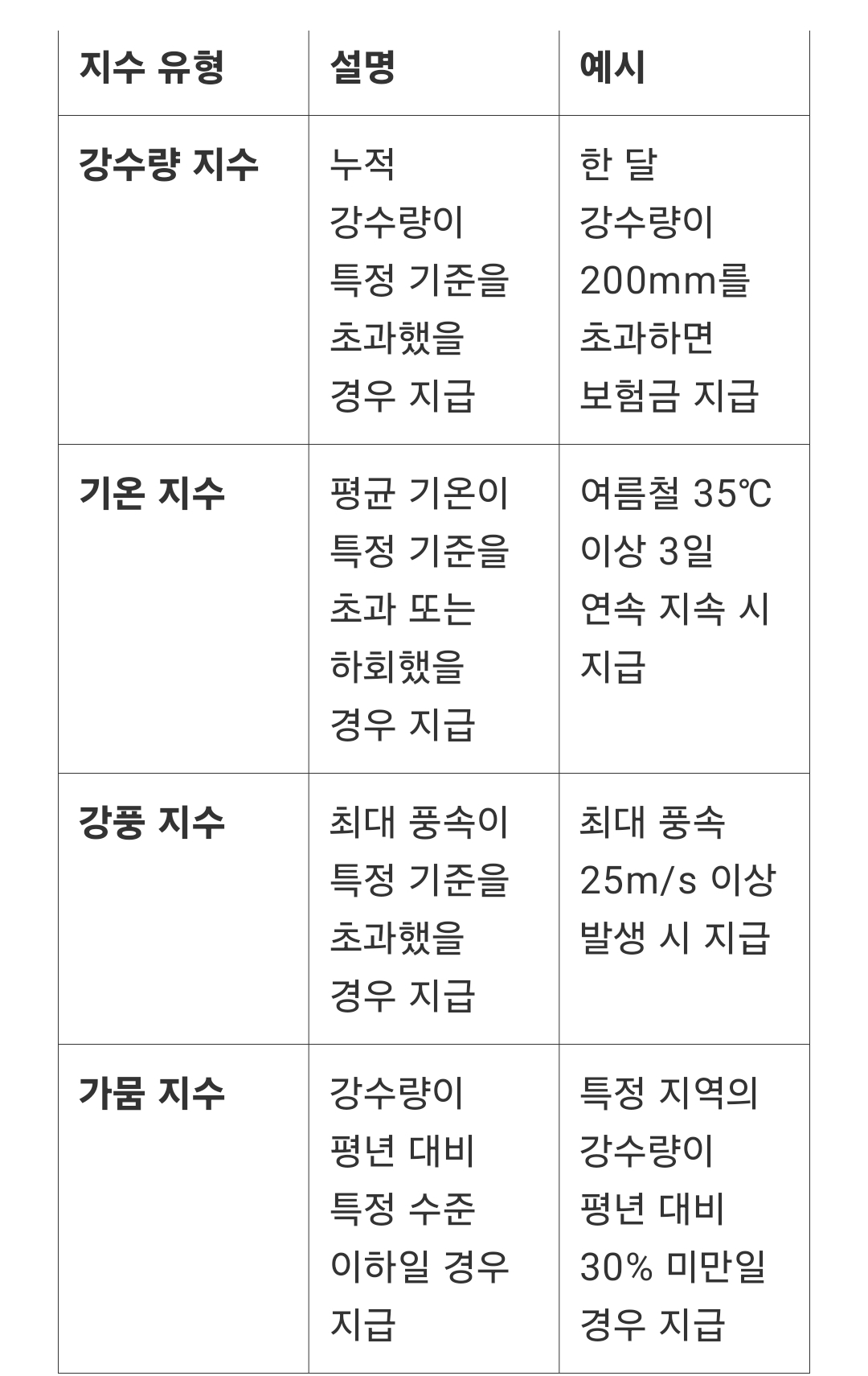 사전에 설정한 기후 지수(강수량, 기온, 풍속 등)가 기준치에 도달하면 보험금 지급