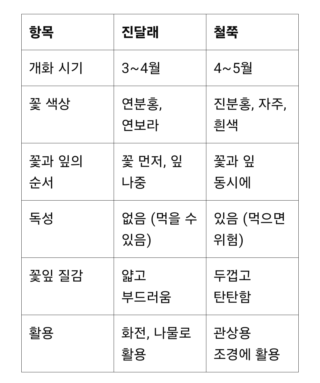 > 헷갈릴 땐 절대 채취하지 마세요! 독성이 있는 철쭉을 진달래로 착각해 먹으면 큰일 날 수 있습니다.