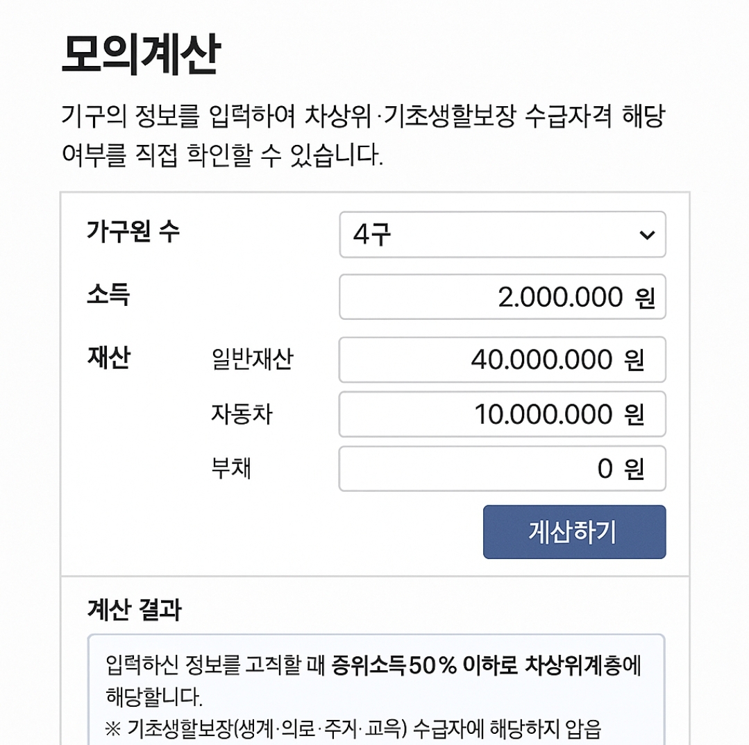예: 4인 가구 기준 월 소득인정액이 약 1,966,000원 이하