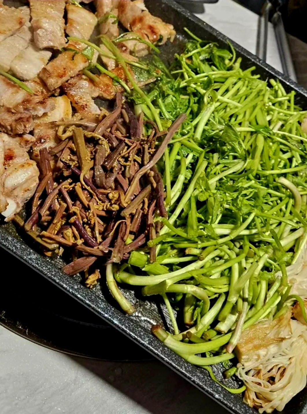 ✔ "삼겹살을 미나리에 싸 먹으니 기름진 맛이 깔끔하게 정리됨!"