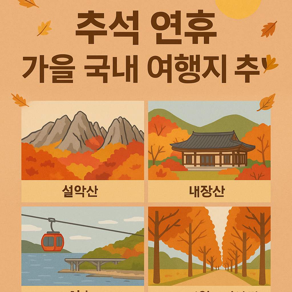 추석 연휴는 가족과의 만남뿐 아니라 새로운 추억을 만들기에 좋은 시기입니다. 단풍이 아름다운 설악산과 내장산, 전통이 살아 있는 안동과 경주, 낭만적인 여수와 제주, 힐링 산책이 가능한 담양과 서울숲까지 모두 각자의 매력이 넘치는 여행지입니다.