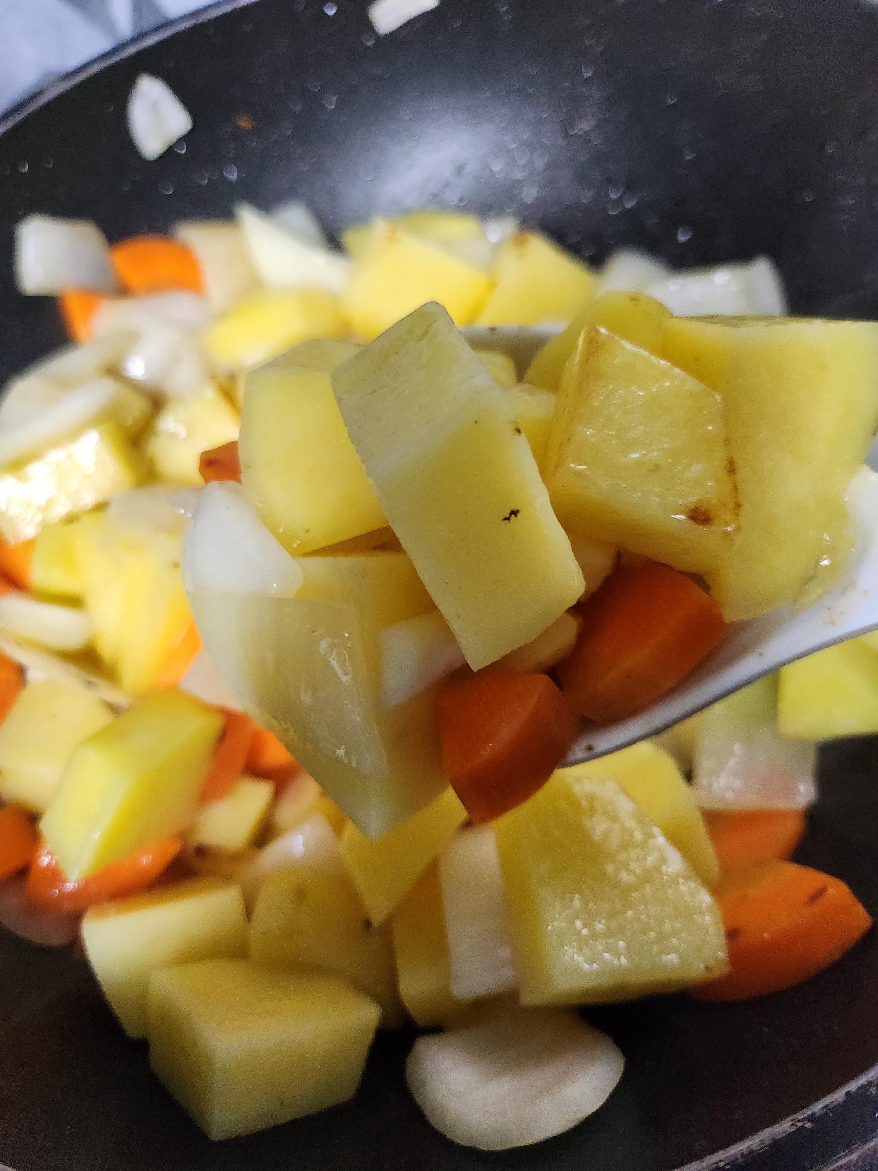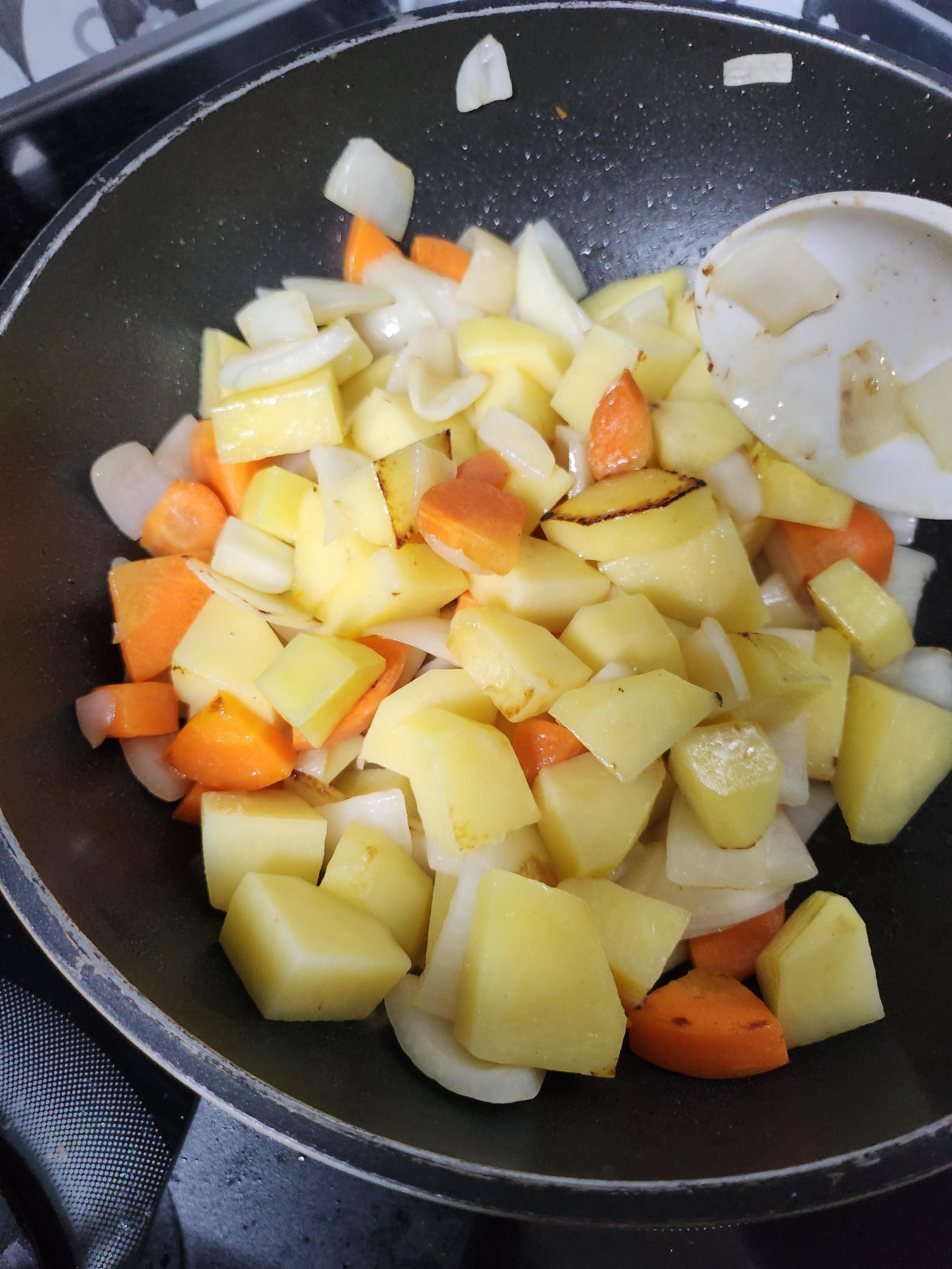 2. 팬에 기름을 두르고 양파를 볶다가 고기, 감자, 당근을 함께 넣어 볶는다.