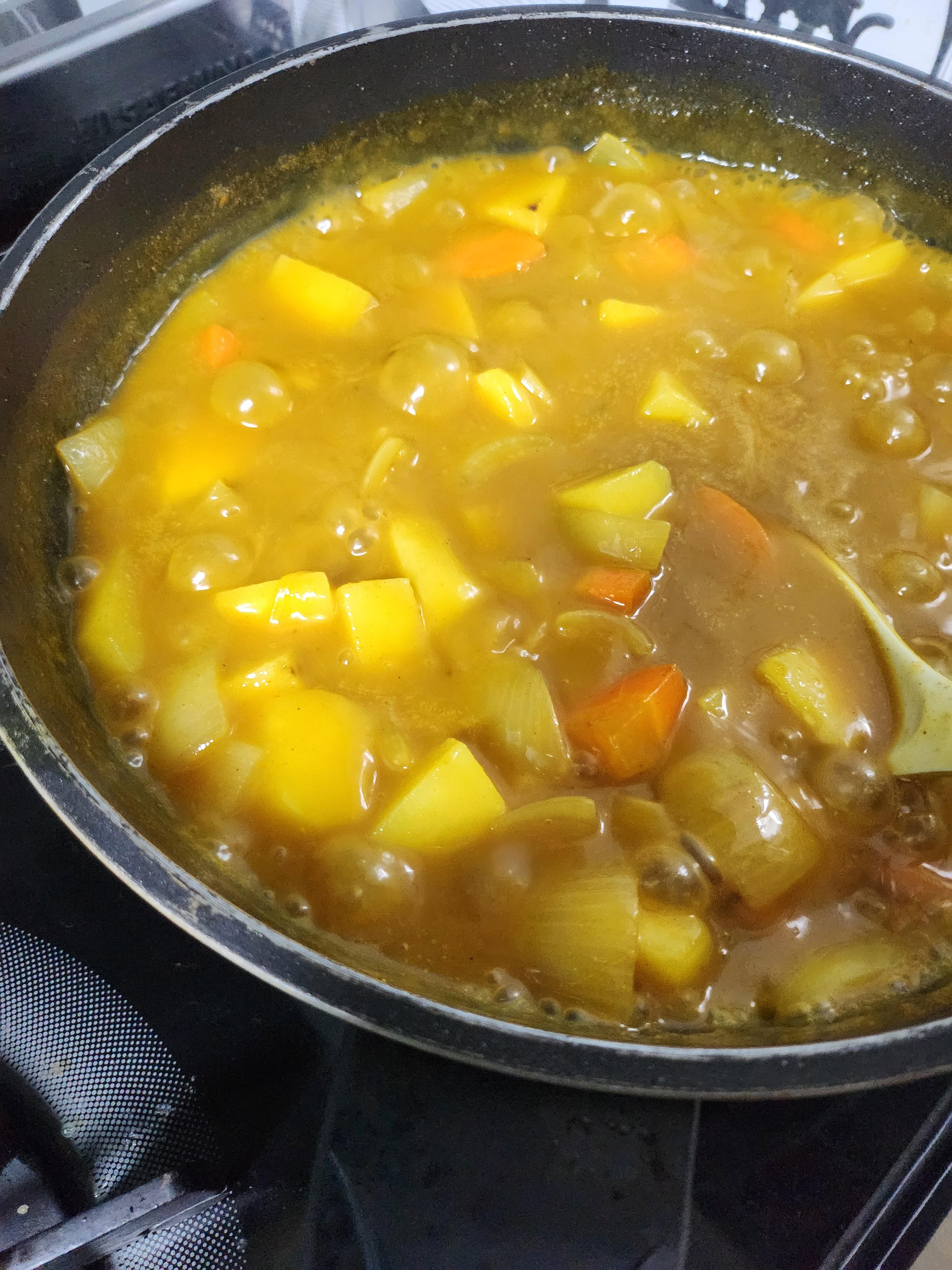 4. 물이 끓어오르면 카레가루를 넣고 저어가며 약한 불로 끓인다.