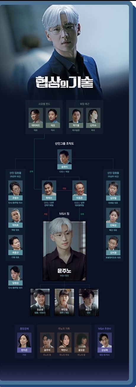**<협상의 기술>**은 냉철한 판단력과 뛰어난 전략으로 한국 최고의 M&A(인수합병) 전문가로 불리는 ‘윤주노’가 자신의 팀원들과 함께 기업 인수합병 과정에서 벌어지는 치열한 심리전과 갈등을 그린 드라마입니다. 기업 간의 협상과 권력 다툼 속에서 드러나는 인간 관계의 복잡함을 사실적으로 묘사하여 몰입도를 높입니다.