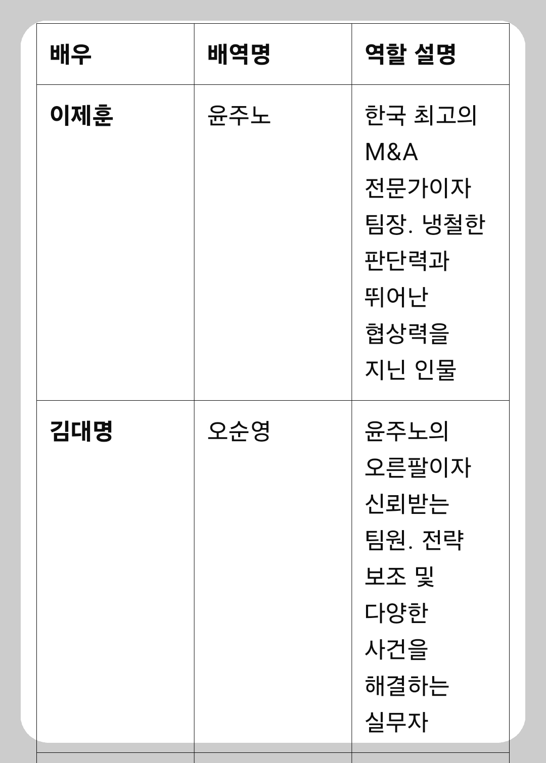 윤주노는 뛰어난 협상 전문가로, 다양한 기업의 인수합병 과정에서 활약하는 인물입니다.
