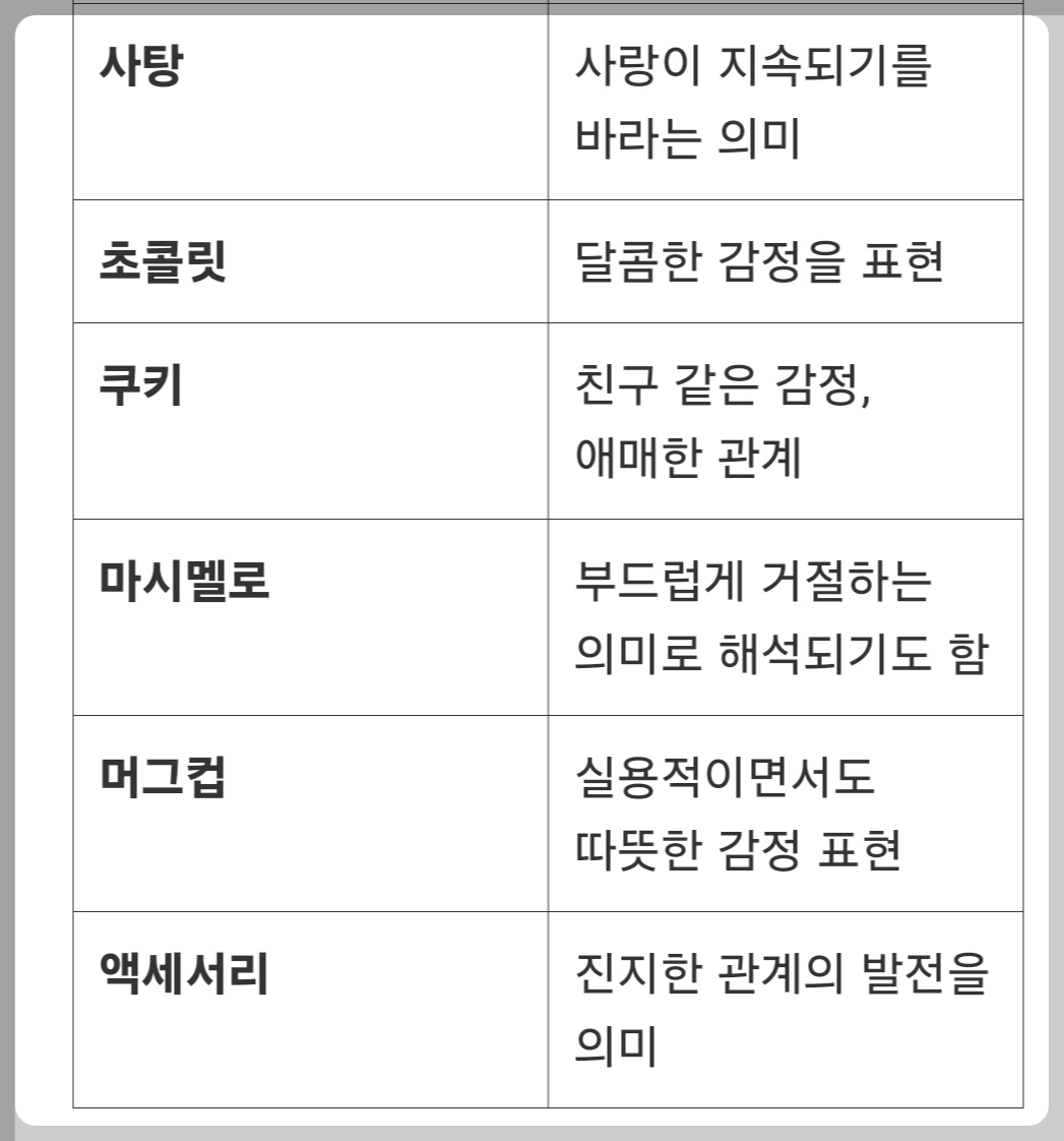 1. 사탕은 천천히 녹아 맛이 오래 지속됨 → 사랑이 지속된다는 의미