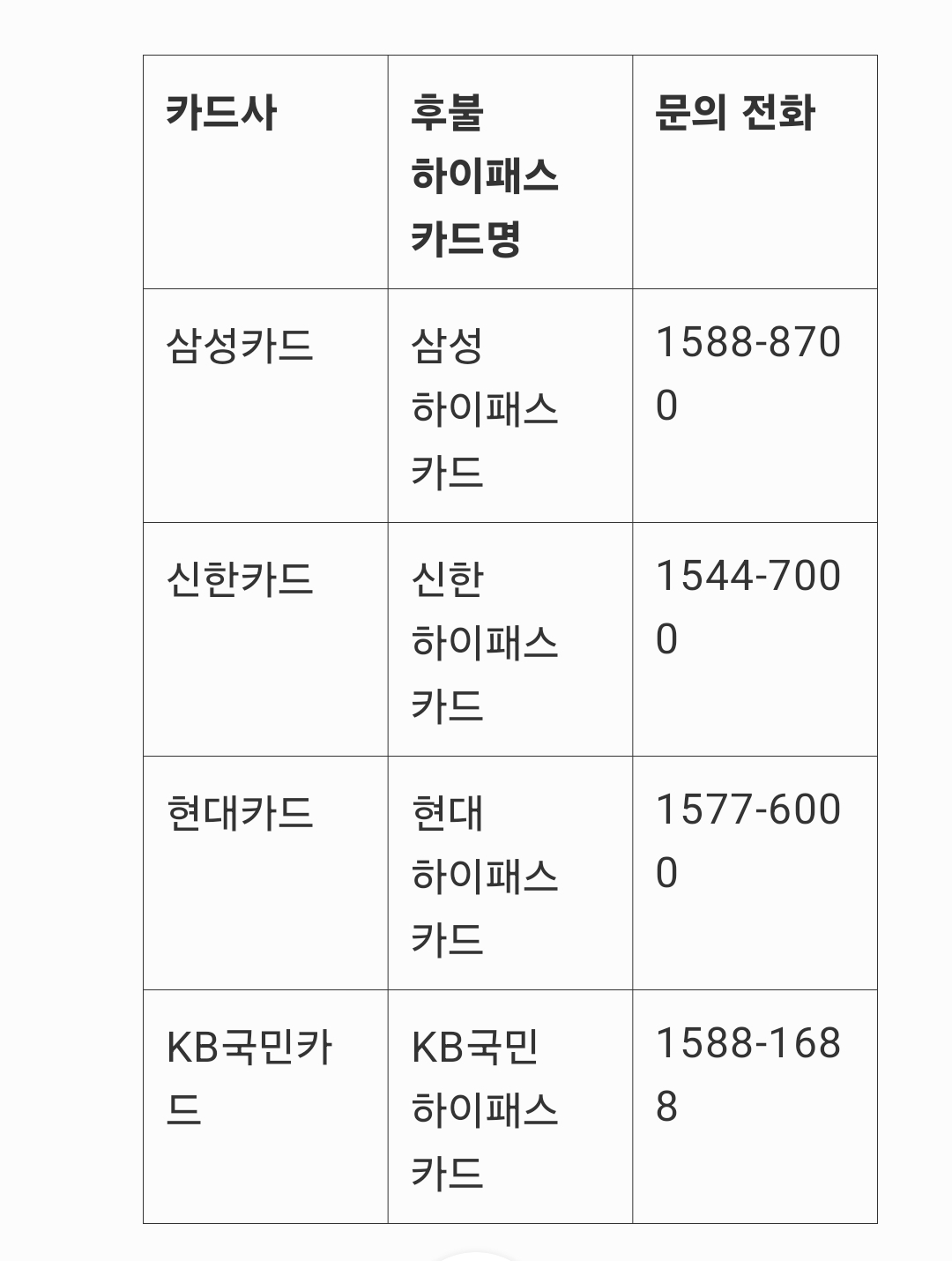 카드사 고객센터에 전화하여 후불 하이패스 기능을 요청합니다.