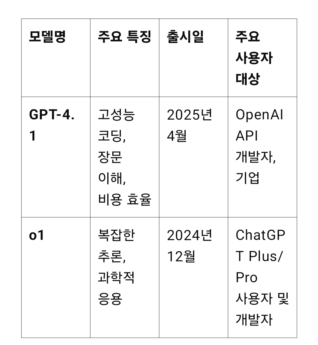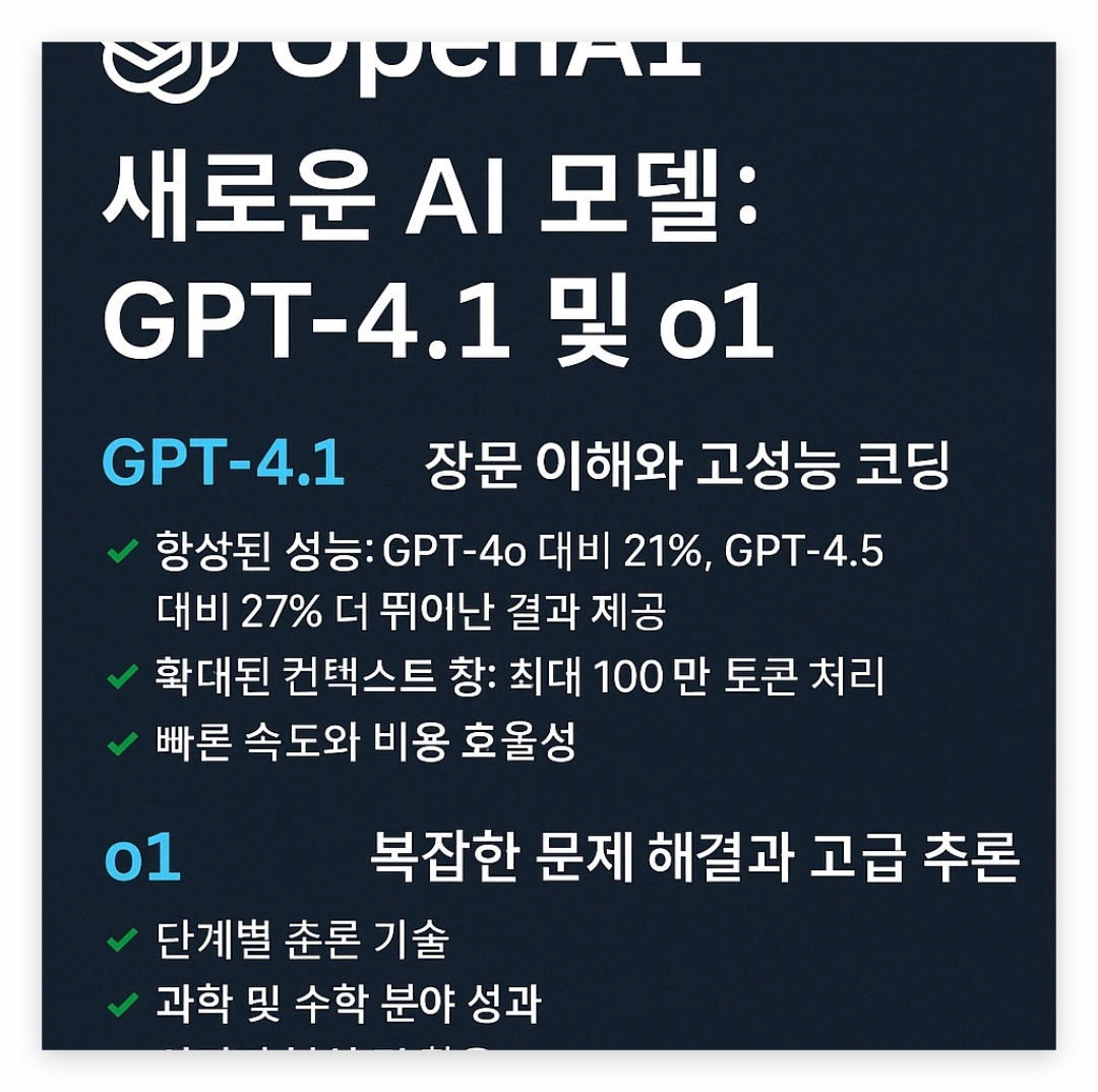OpenAI의 최신 모델 GPT-4.1과 o1은 각각의 용도와 특성에 따라 선택하여 사용할 수 있습니다.